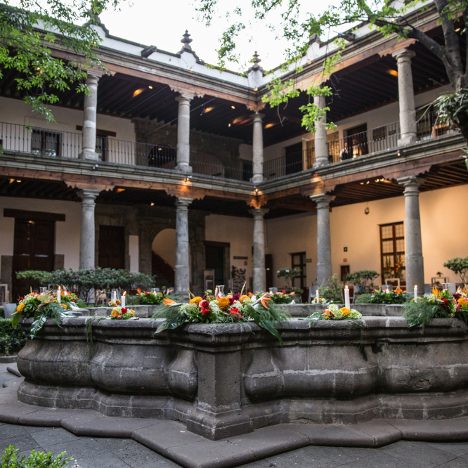 Patio colonial con una fuente central decorada con flores coloridas y velas, rodeado de jardines y arquitectura tradicional.